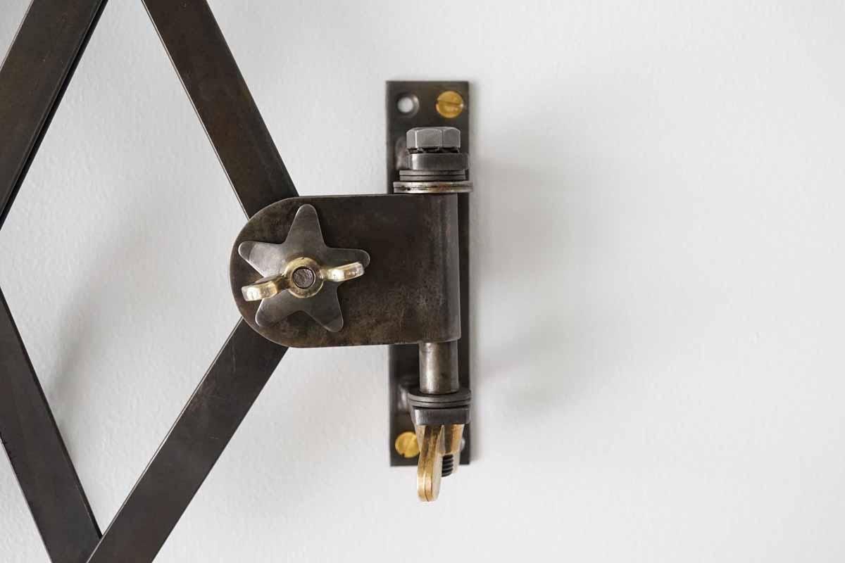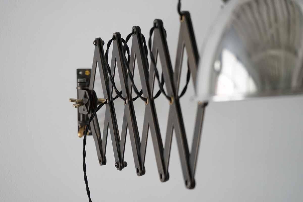 フランス『MAZDA』社製のシザーランプ。近年このシザータイプはフランスでも入手困難な希少価値のあるモデルになってきてます。多用途に光の角度を調整できるので様々なシーンでご使用いただけます。壁付部分は欠品していたので新たに製作しております。スイッチ部分も問題なくご使用頂けます。配線仕様は、コンセントタイプでコードは2mお付けいたします。電球は付きませんのでご了承ください。コード長さ調整、仕様変更可。配線仕様の変更ご希望の場合は備考欄にご記入ください。ヴィンテージランプにつきLED電球の使用を推奨いたします。
