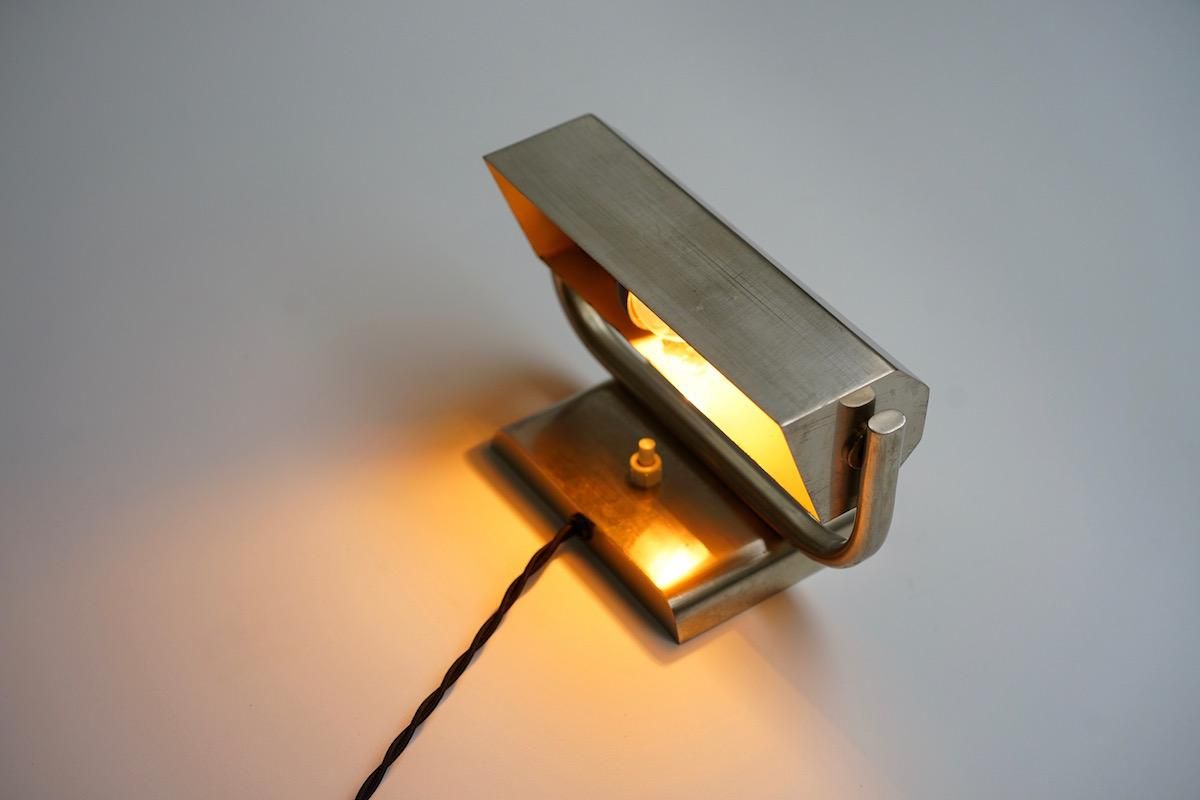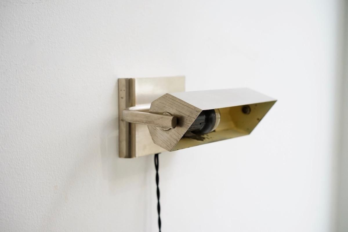 ドイツで仕入れたウォールランプ。装飾的なデザインは排除されインダスリーな雰囲気もありつつ造形がアールデコ当時の造形美があり大変珍しい一品です。フレーム部分はクロームメッキが施されておりシェード部分は上下に稼動します。配線仕様は、コンセントタイプでコードは2mお付けいたします。コード長さ調整、仕様変更可。配線仕様の変更ご希望の場合は備考欄にご記入ください。スイッチも使用できグットコンディションです。