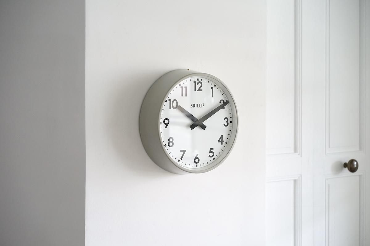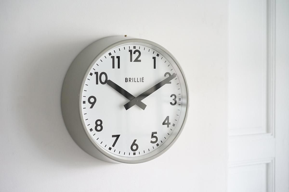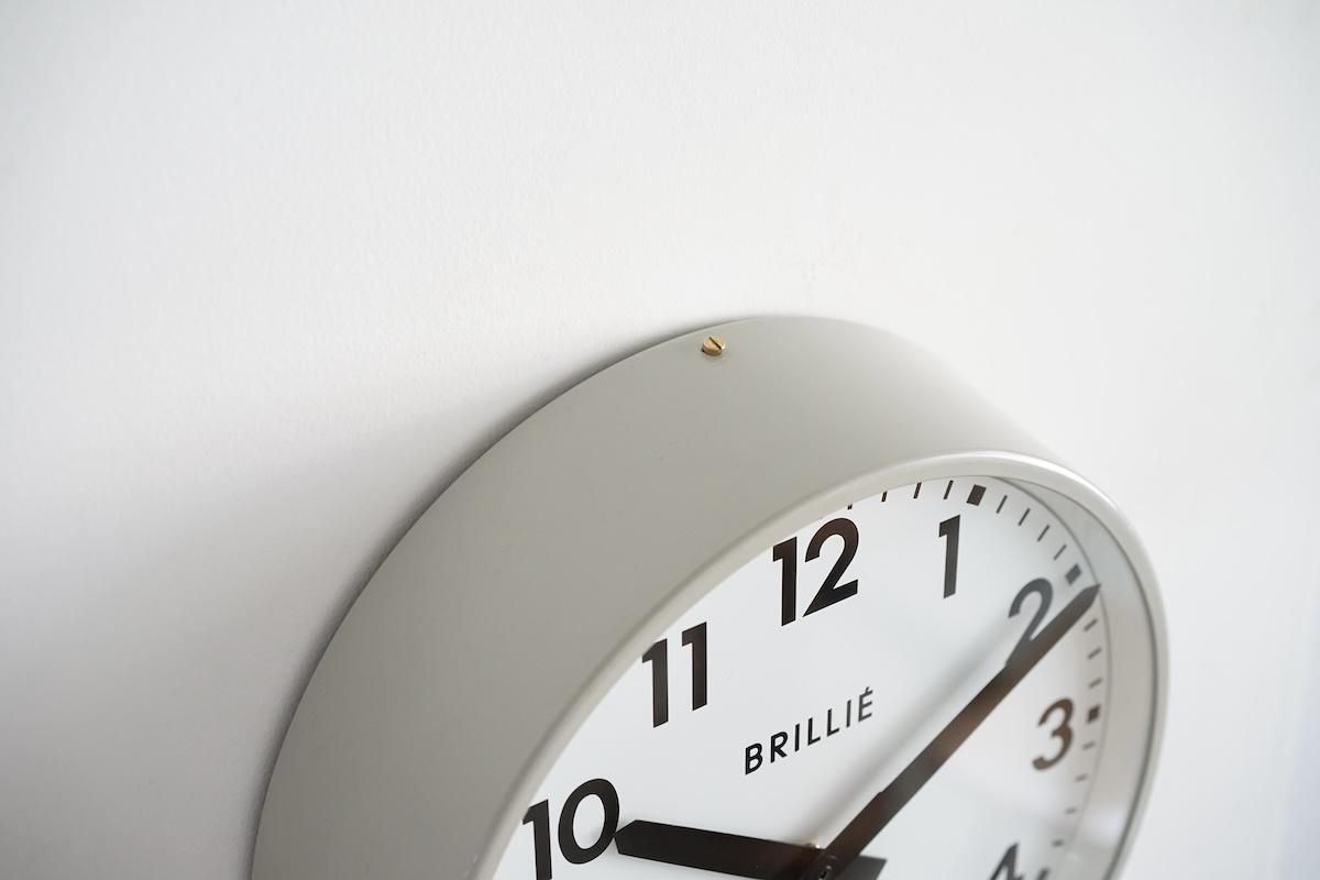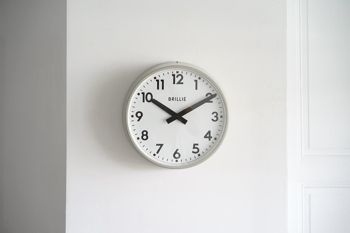 フランス『BRILLIE』社製のウォールクロック。1898年にフランスで創業されメトロや学校など多くの公共施設で使用されているフランスの時計メーカー。オリジナルのフレームカラーがフランスらしくとても良い色合いです。文字盤含め大きなペイントロスもなくデットストックに近く大変良いコンディションです。ムーブメントは音のしないスイープタイプに交換しており単三電池で稼働します。軽量ですので石膏ボードの壁にも取り付け可能です。