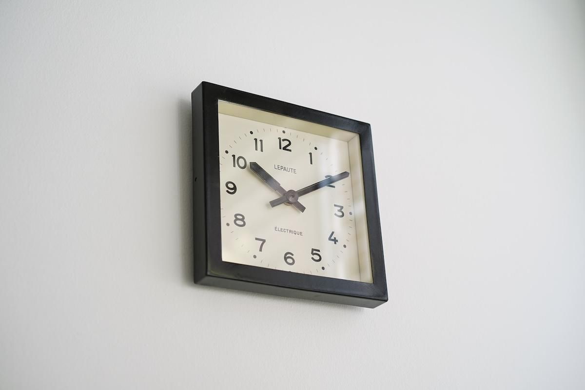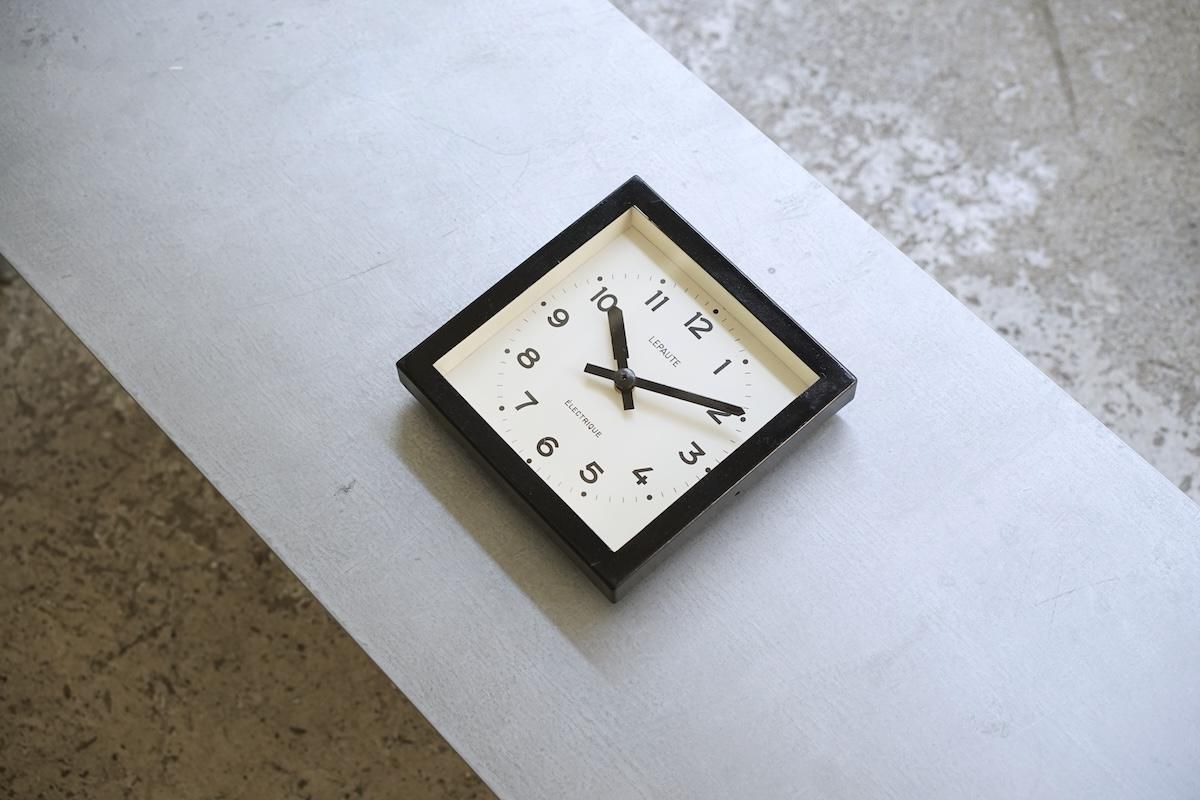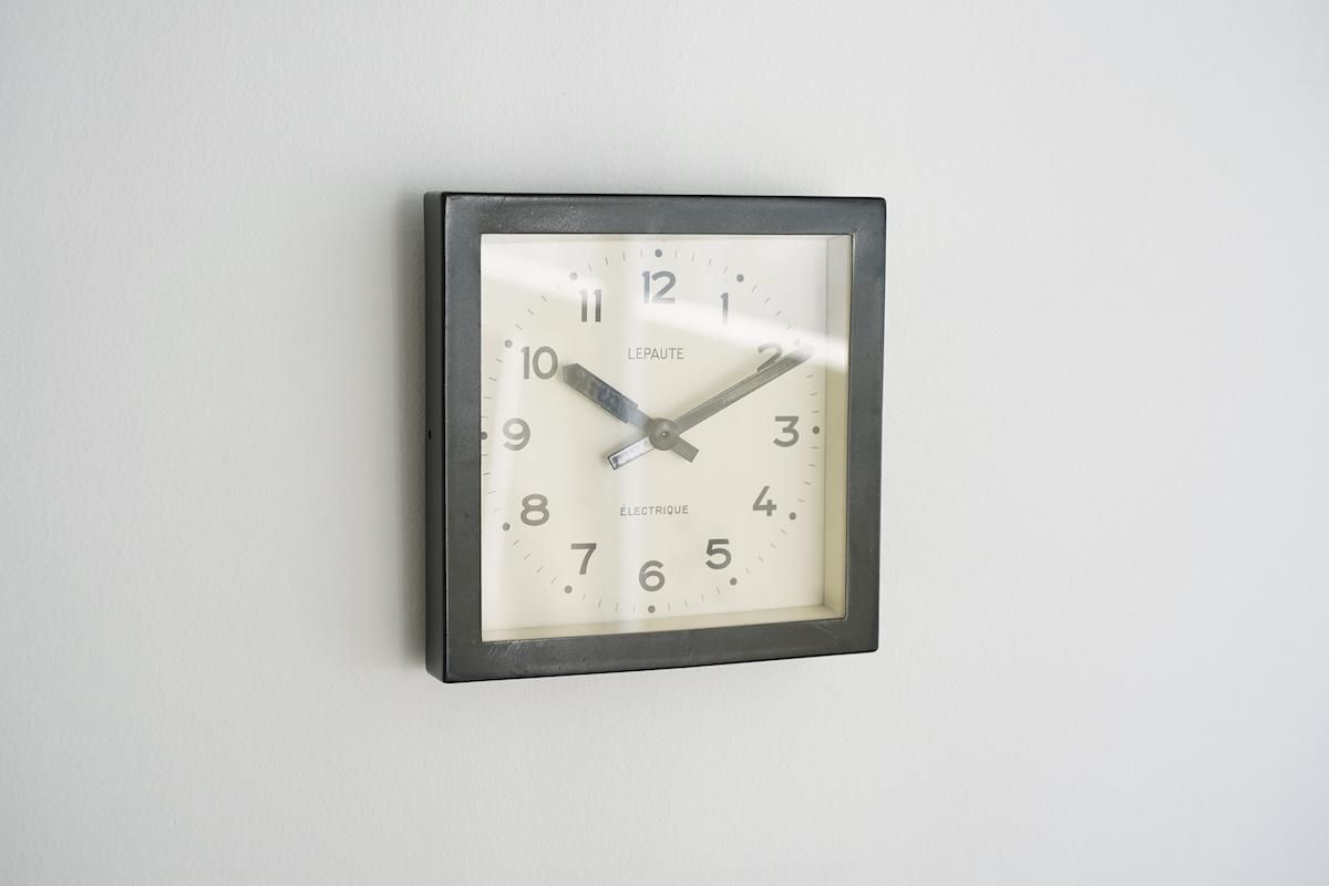 フランス『LEPAUTE』社製のウォールクロック。1950年代頃フランスのインダストリアルクロックといえばBRILLIEかLEPAUTEというくらいフランスでも親しまれている時計の製造メーカーです。当店では初見のモデルで潔いデザインが◎文字盤のカラーはアイボリーとオフホワイトの中間くらいの絶妙な色味が大変良いです。フレームはオリジナルのブラックカラーで大変良い状態で保たれております。壁から15mm程度浮いているので立体感のある佇まいです。ムーブメントは音のしないスイープタイプに交換しており単三電池で稼働します。軽量ですので石膏ボードの壁にも取り付け可能です。
