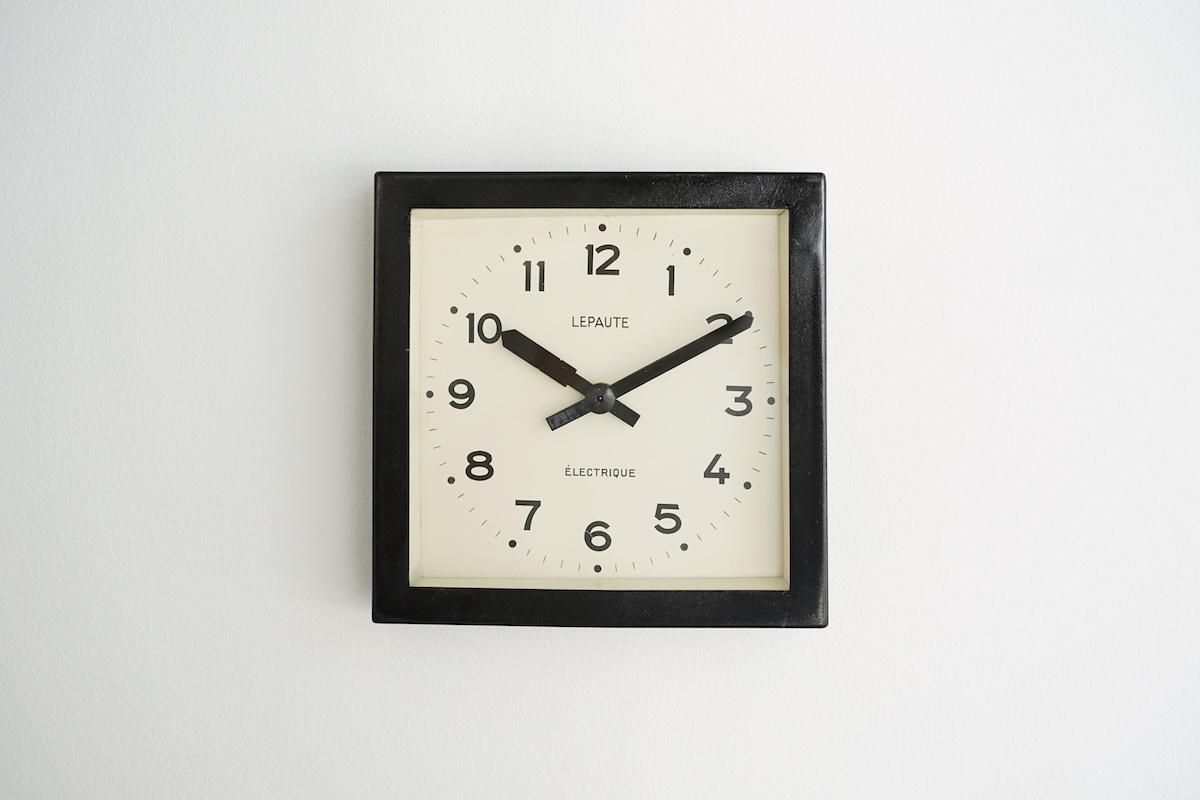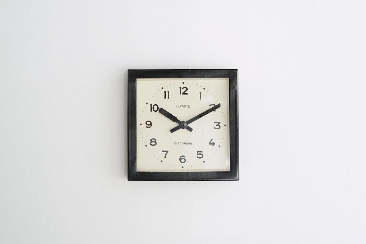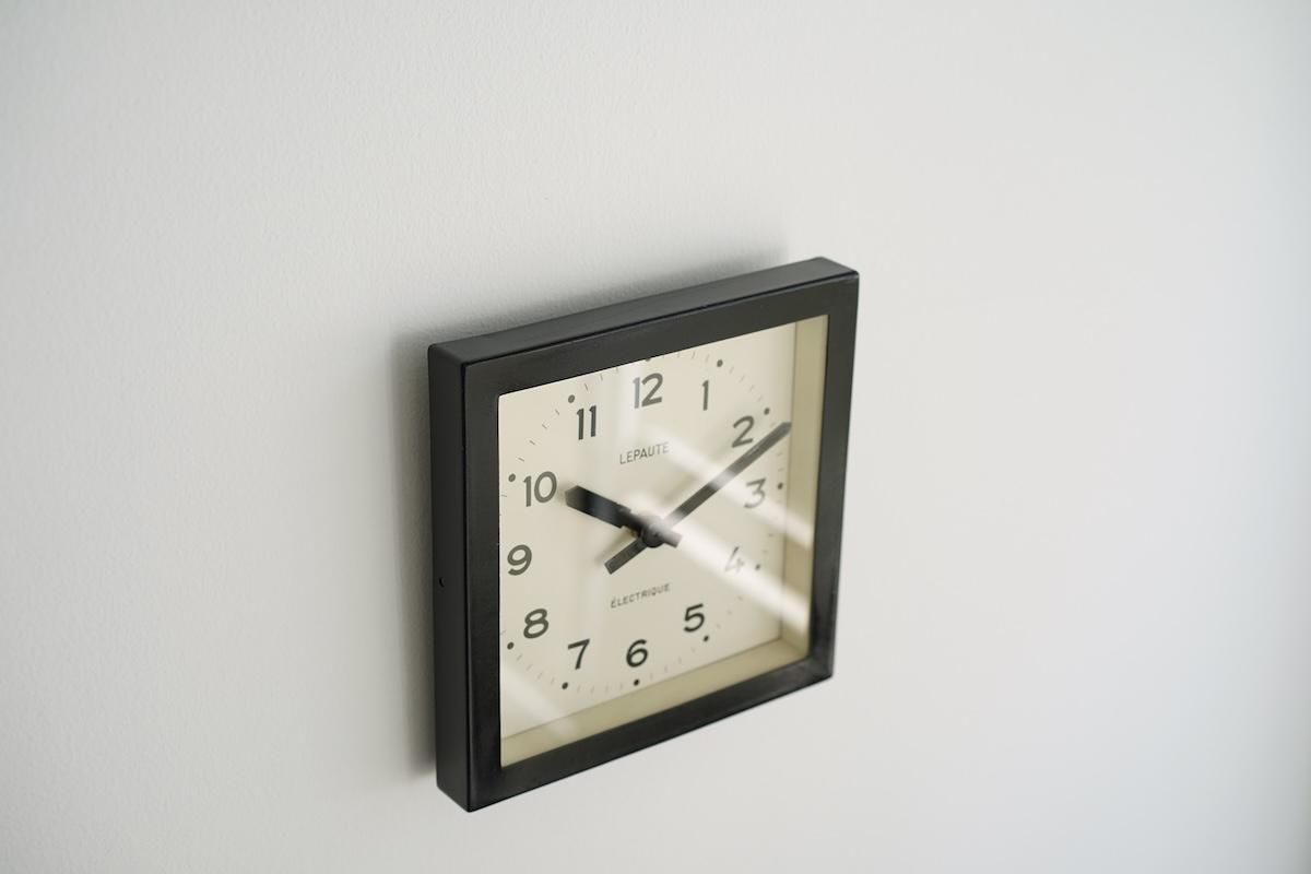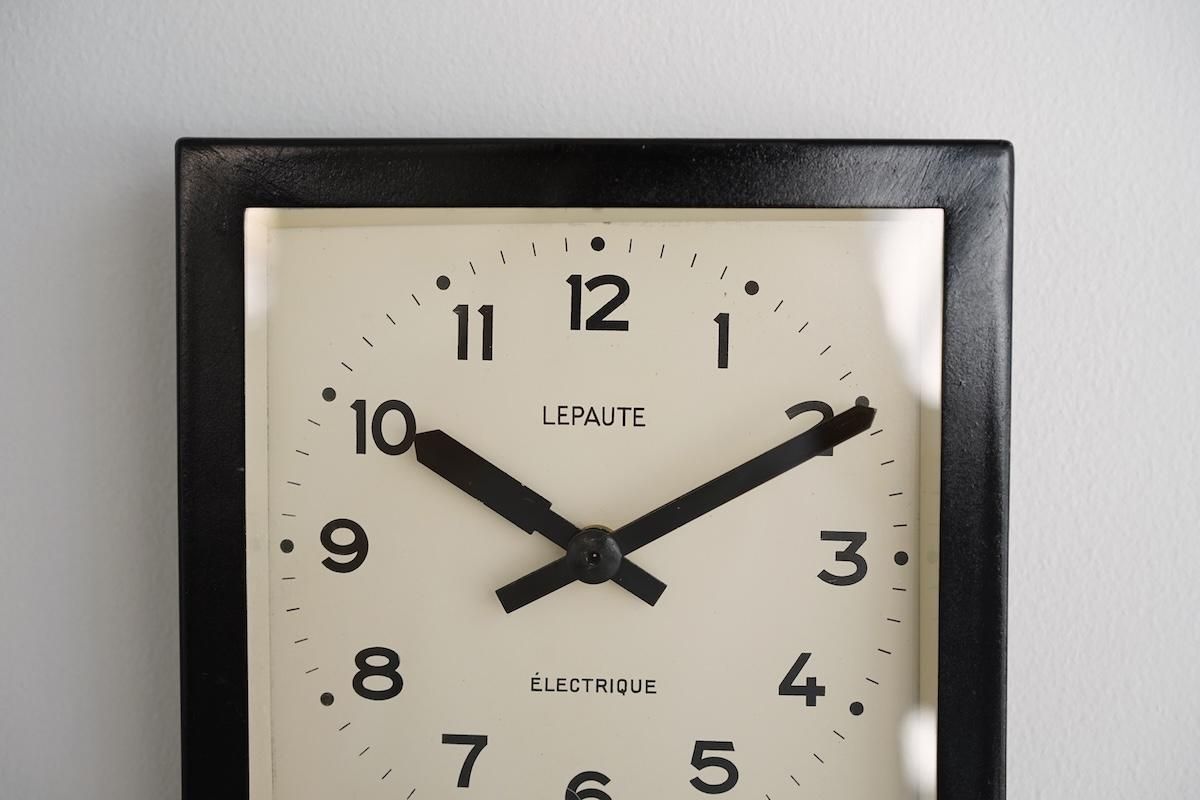フランス『LEPAUTE』社製のウォールクロック。1950年代頃フランスのインダストリアルクロックといえばBRILLIEかLEPAUTEというくらいフランスでも親しまれている時計の製造メーカーです。当店では初見のモデルで潔いデザインが◎文字盤のカラーはアイボリーとオフホワイトの中間くらいの絶妙な色味が大変良いです。フレームはオリジナルのブラックカラーで大変良い状態で保たれております。壁から15mm程度浮いているので立体感のある佇まいです。ムーブメントは音のしないスイープタイプに交換しており単三電池で稼働します。軽量ですので石膏ボードの壁にも取り付け可能です。