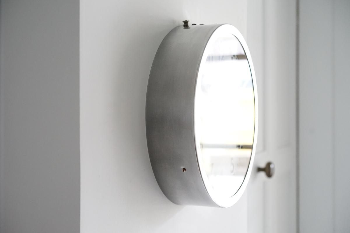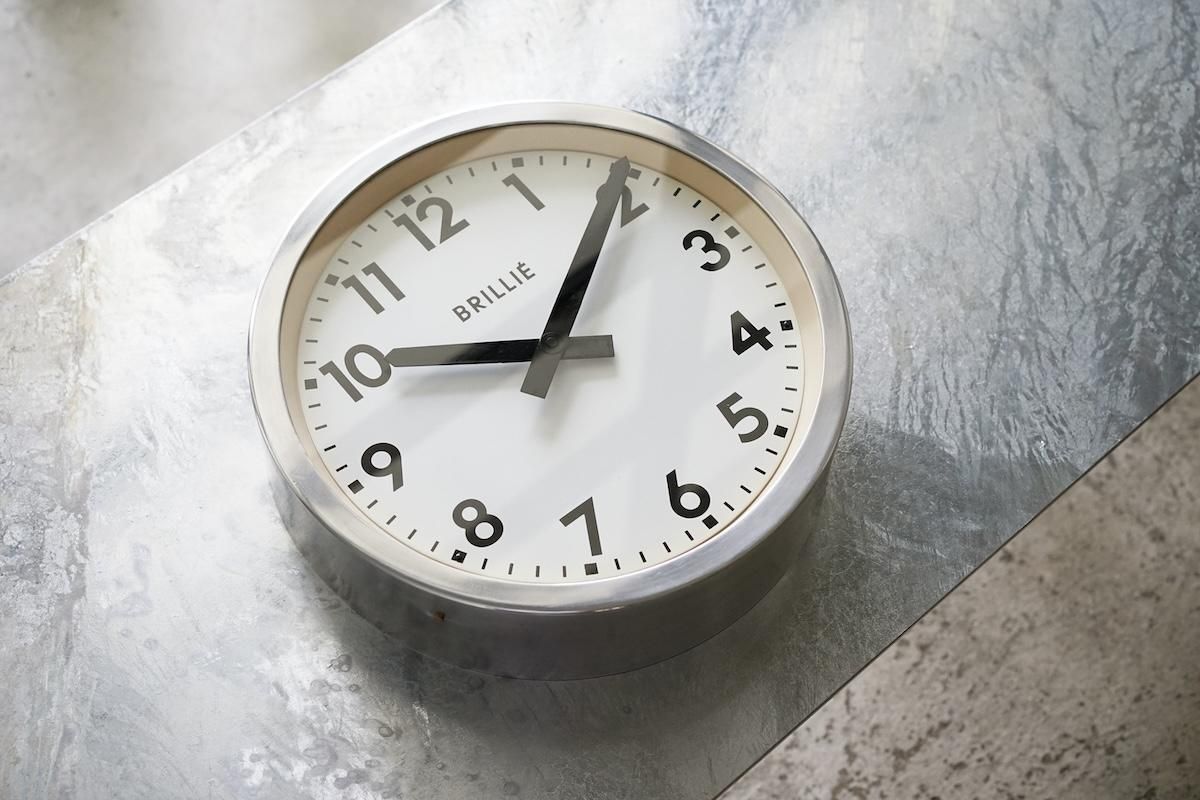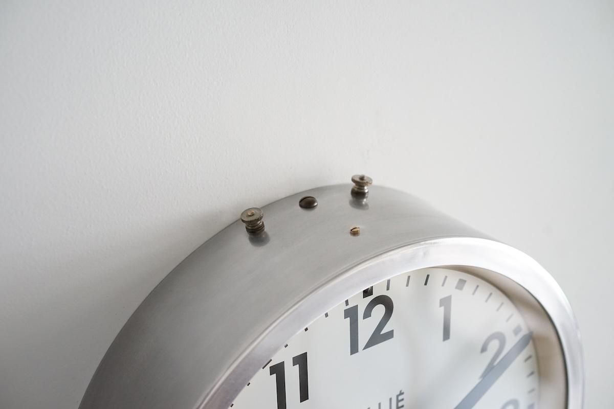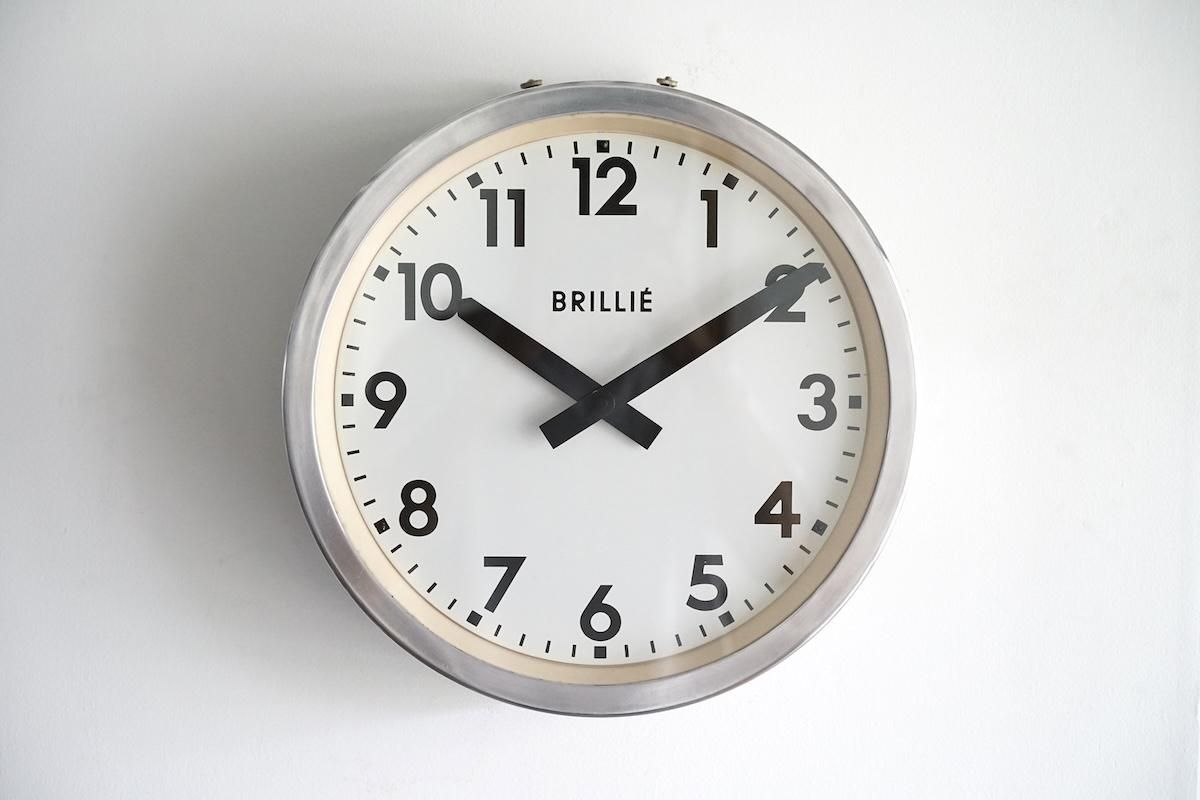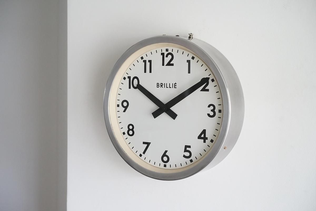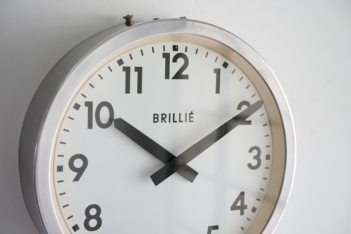 フランス『BRILLIE』社製のウォールクロック。1898年にフランスで創業されメトロや学校など多くの公共施設で使用されているフランスの時計メーカー。素地のアルミフレームがクールで◎文字盤の擦れなども無くグッドコンディションです。ムーブメントは音のしないスイープタイプに交換しており単三電池で稼働します。軽量ですので石膏ボードの壁にも取り付け可能です。
