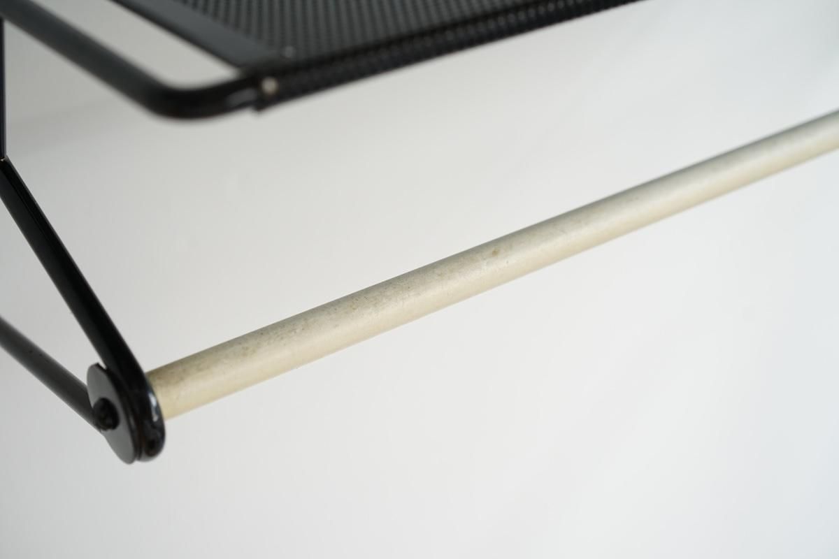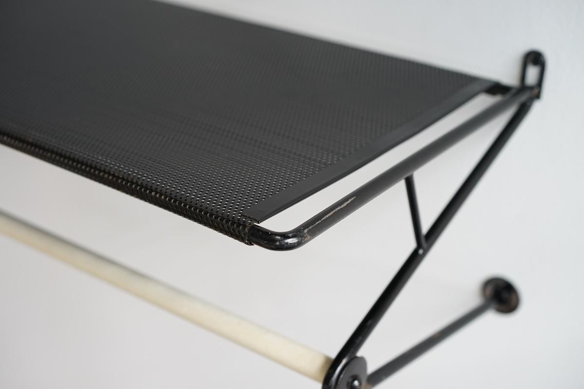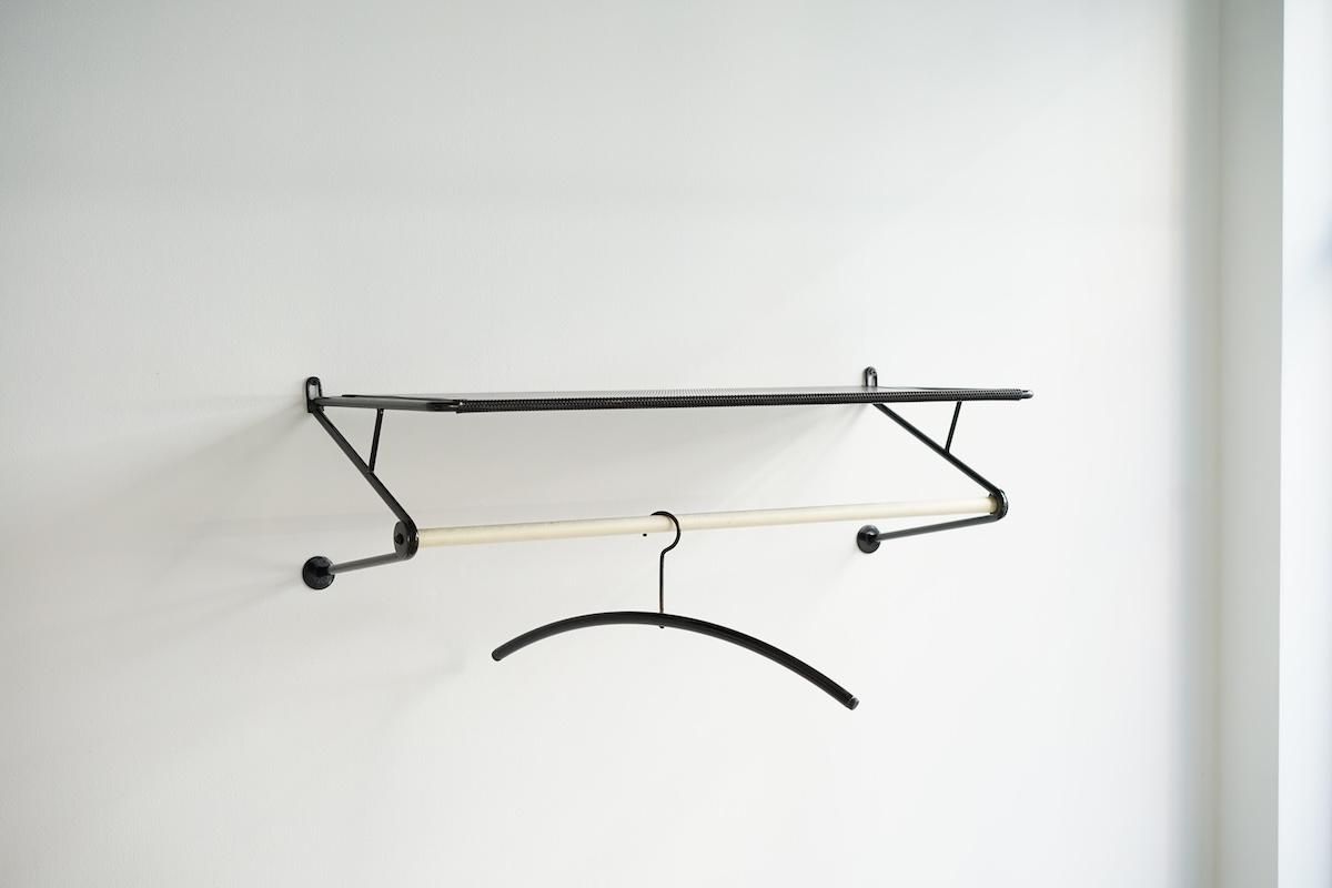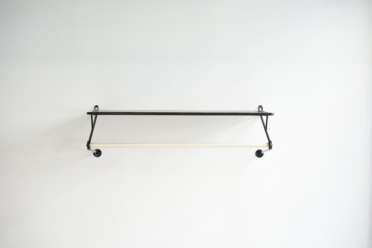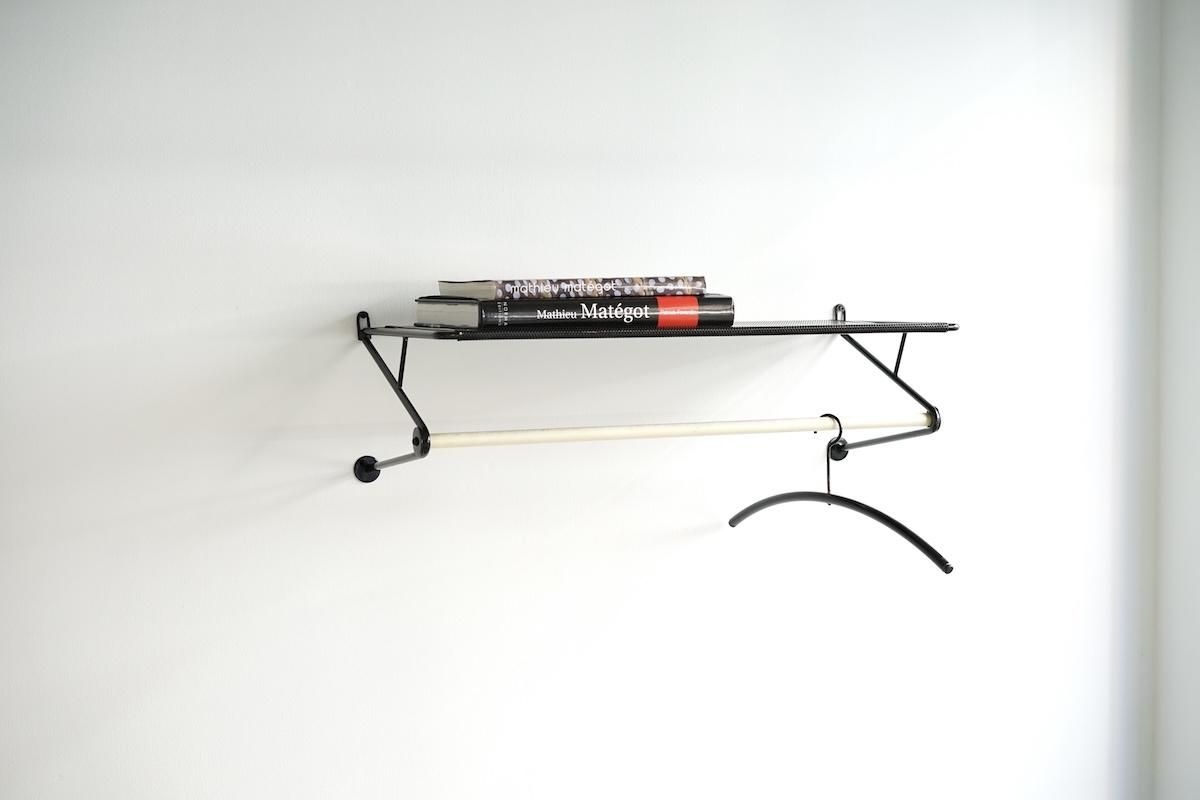 "Mathieu Matégot” デザインのコートラック。シンプルな構造ですがとても理にかなったデザイン性が特徴的です。ラック自体の自重でも安定しておりますがコートなどを掛けると下部のフレームに力が加わり更に安定します。ネジ2本だけでご使用いただけます。壁からバーの中心までが230mmとなります。機能的で簡易的にディスプレイしても絵になる逸品です。全てオリジナルペイントで大変良いコンディションです。オリジナルのハンガーが1本付いております。
