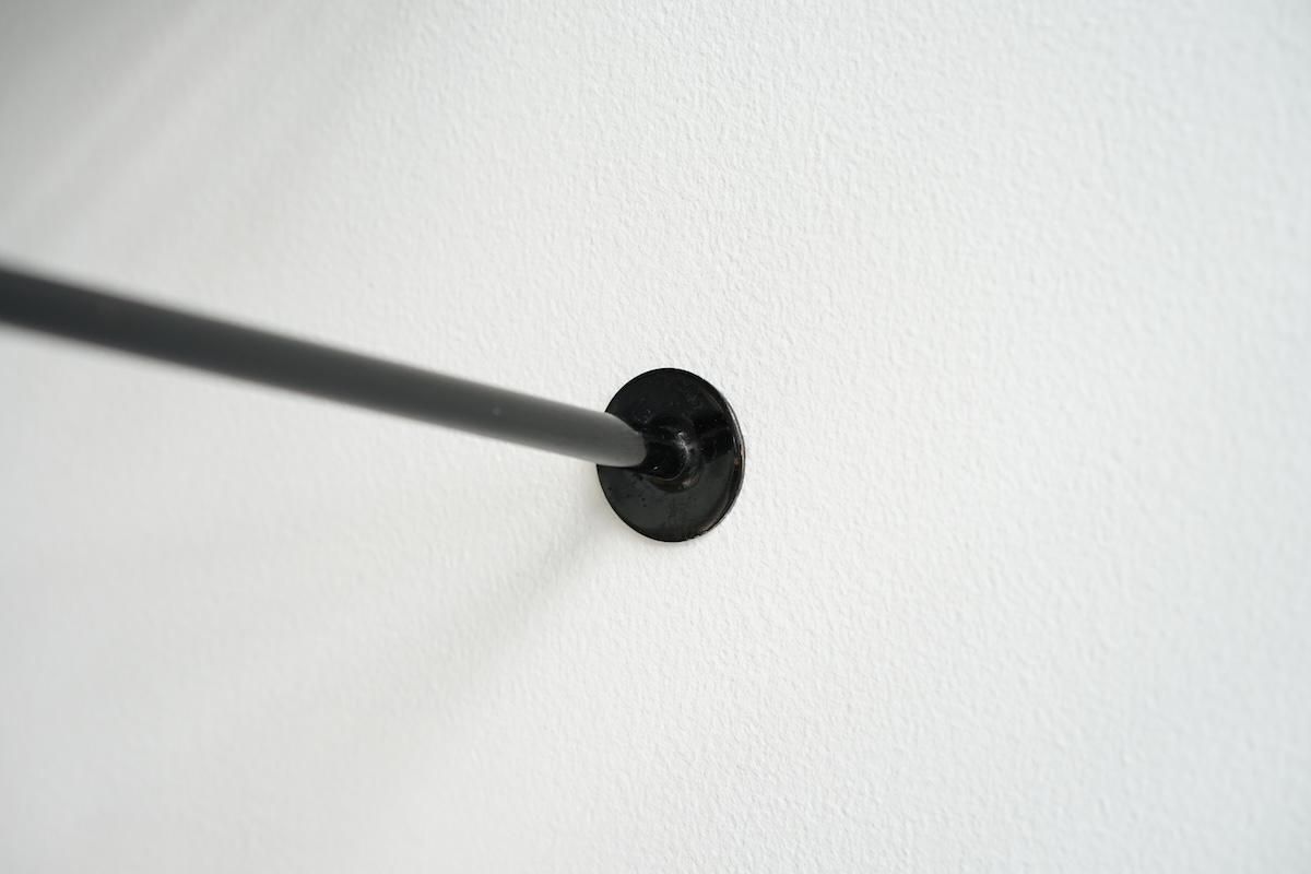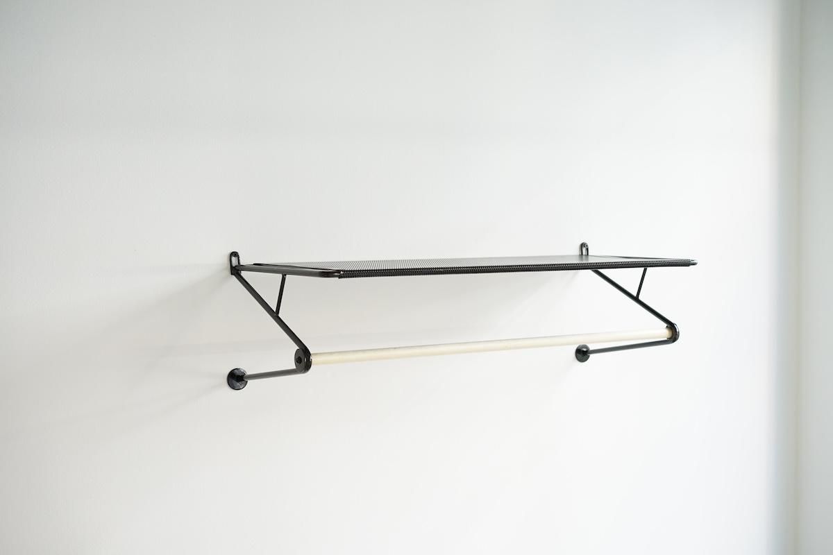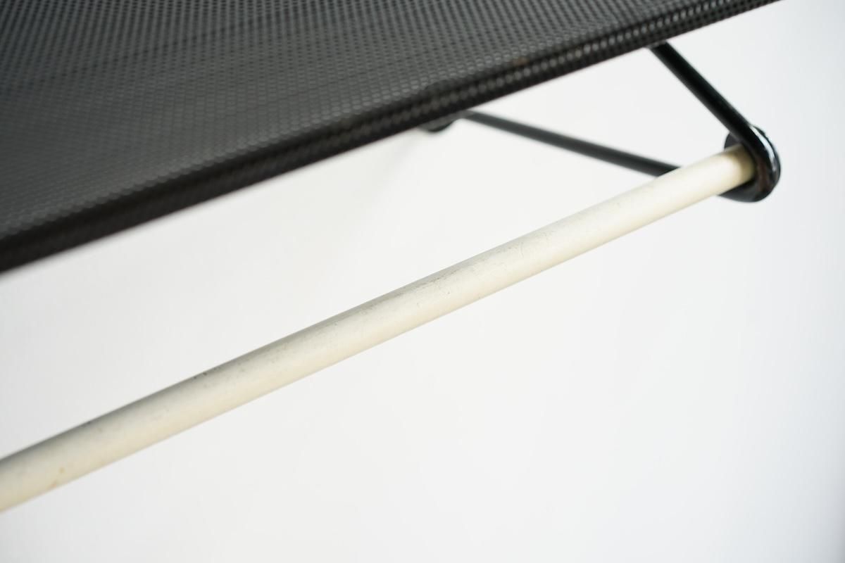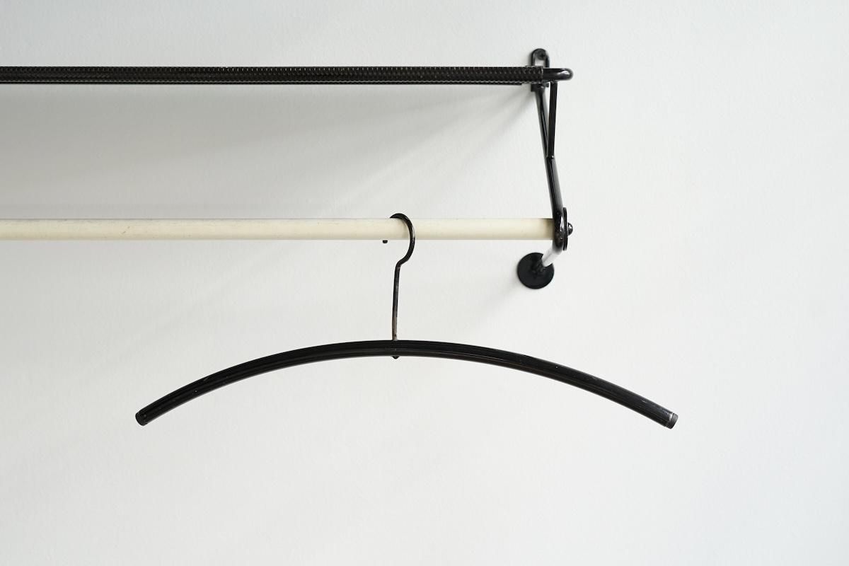 "Mathieu Matégot” デザインのコートラック。シンプルな構造ですがとても理にかなったデザイン性が特徴的です。ラック自体の自重でも安定しておりますがコートなどを掛けると下部のフレームに力が加わり更に安定します。ネジ2本だけでご使用いただけます。壁からバーの中心までが230mmとなります。機能的で簡易的にディスプレイしても絵になる逸品です。全てオリジナルペイントで大変良いコンディションです。オリジナルのハンガーが1本付いております。
