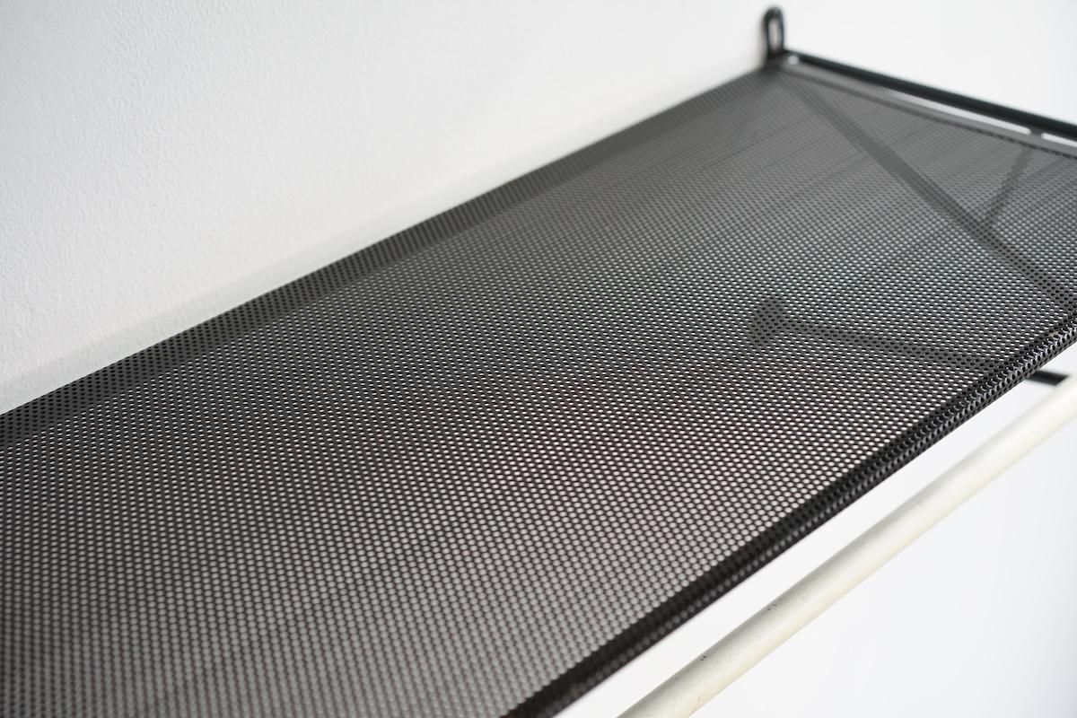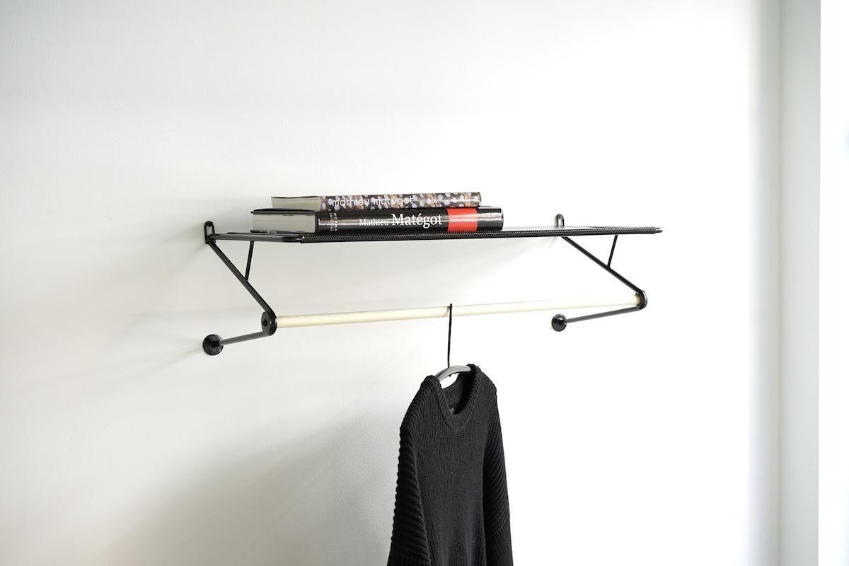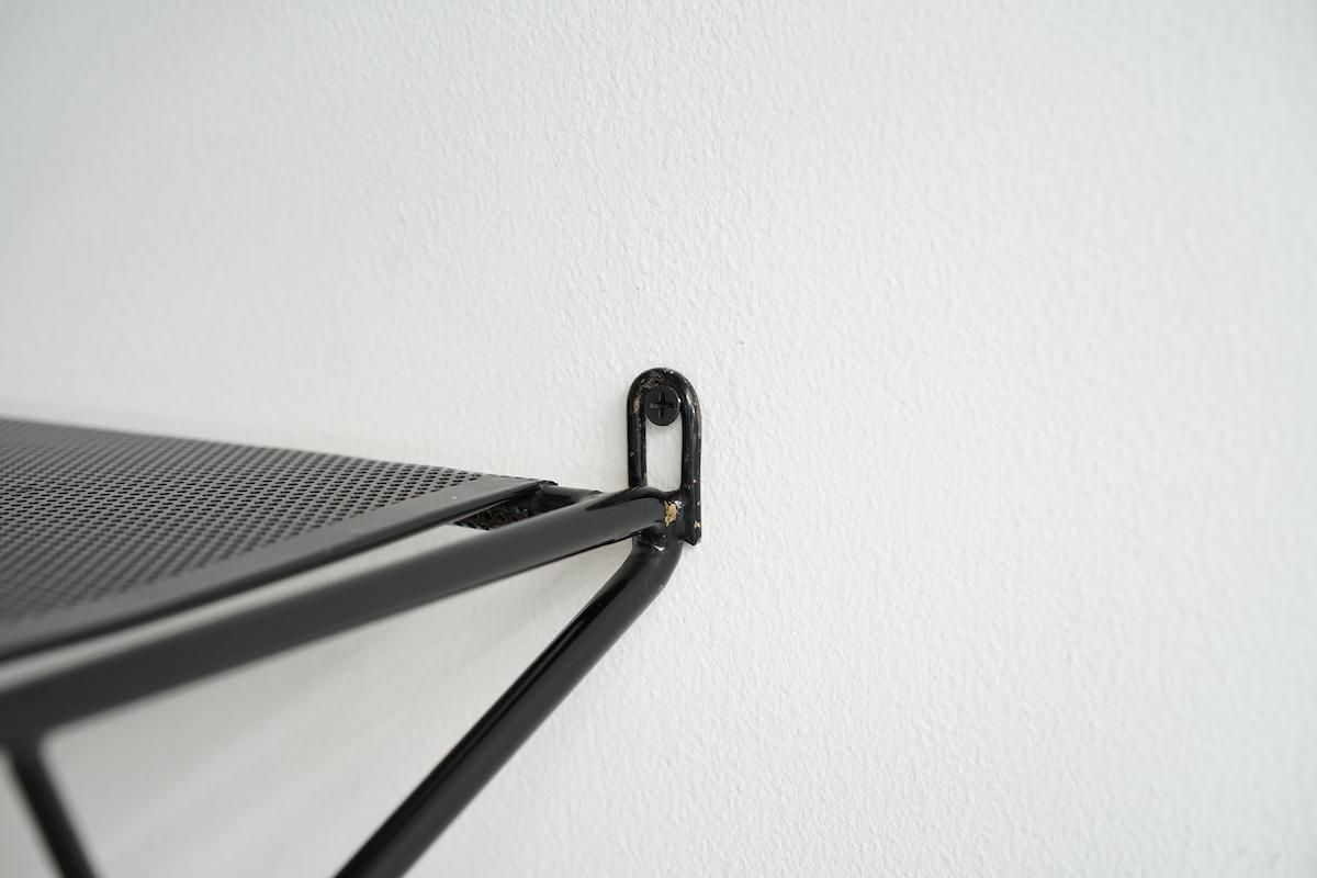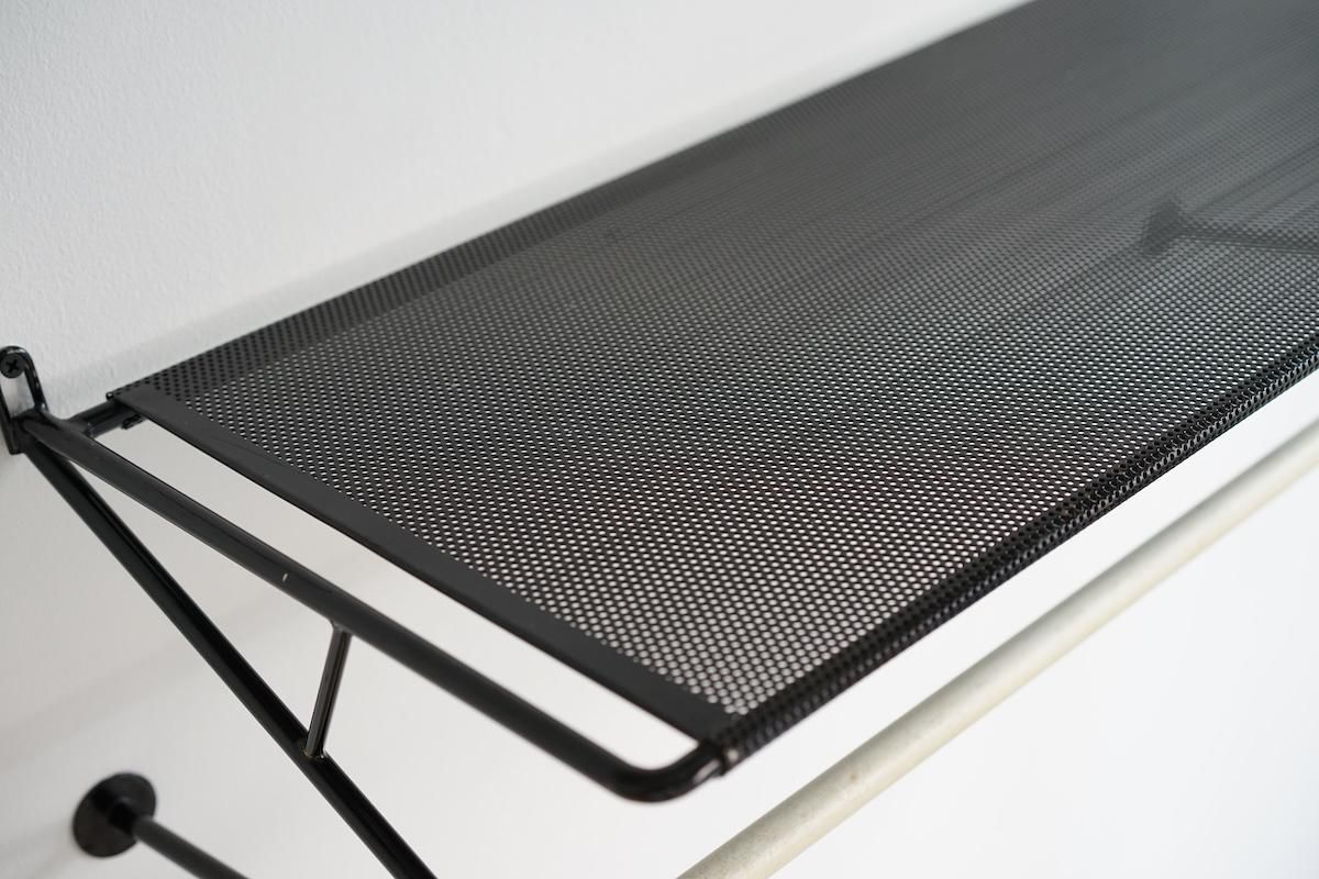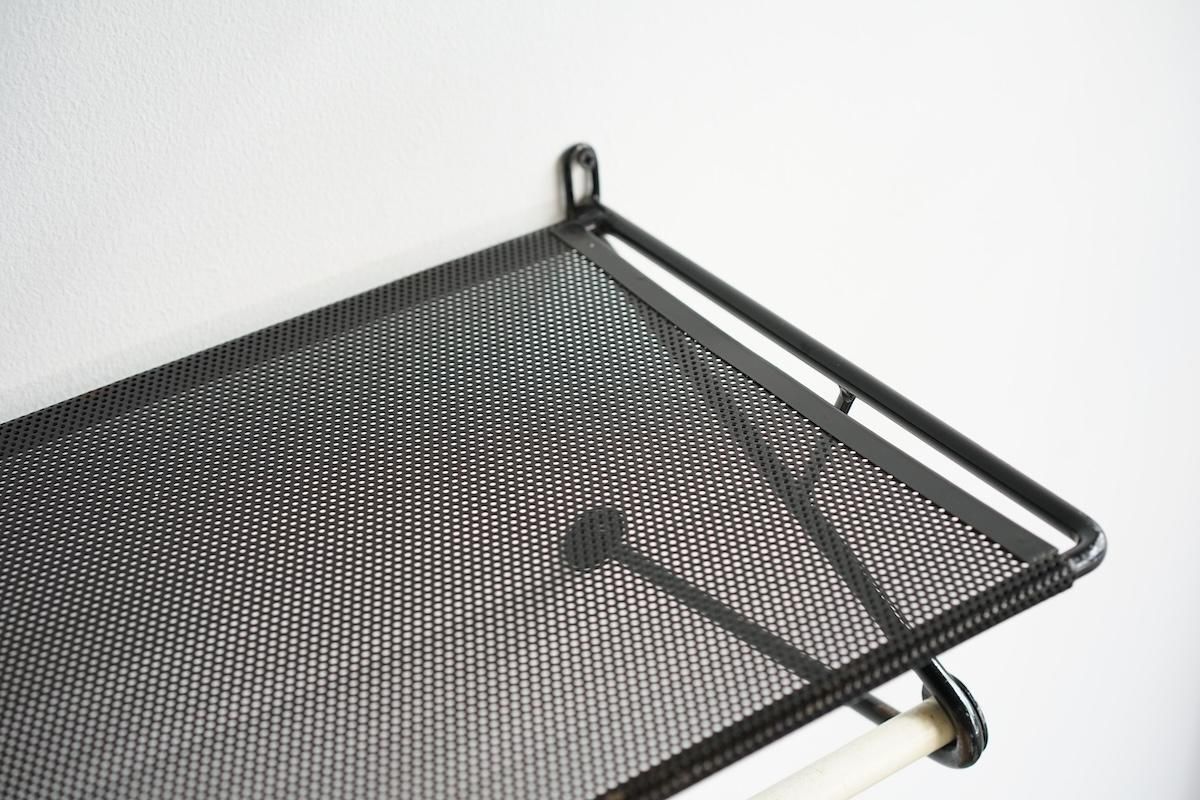 "Mathieu Matégot” デザインのコートラック。シンプルな構造ですがとても理にかなったデザイン性が特徴的です。ラック自体の自重でも安定しておりますがコートなどを掛けると下部のフレームに力が加わり更に安定します。ネジ2本だけでご使用いただけます。壁からバーの中心までが230mmとなります。機能的で簡易的にディスプレイしても絵になる逸品です。全てオリジナルペイントで大変良いコンディションです。オリジナルのハンガーが1本付いております。