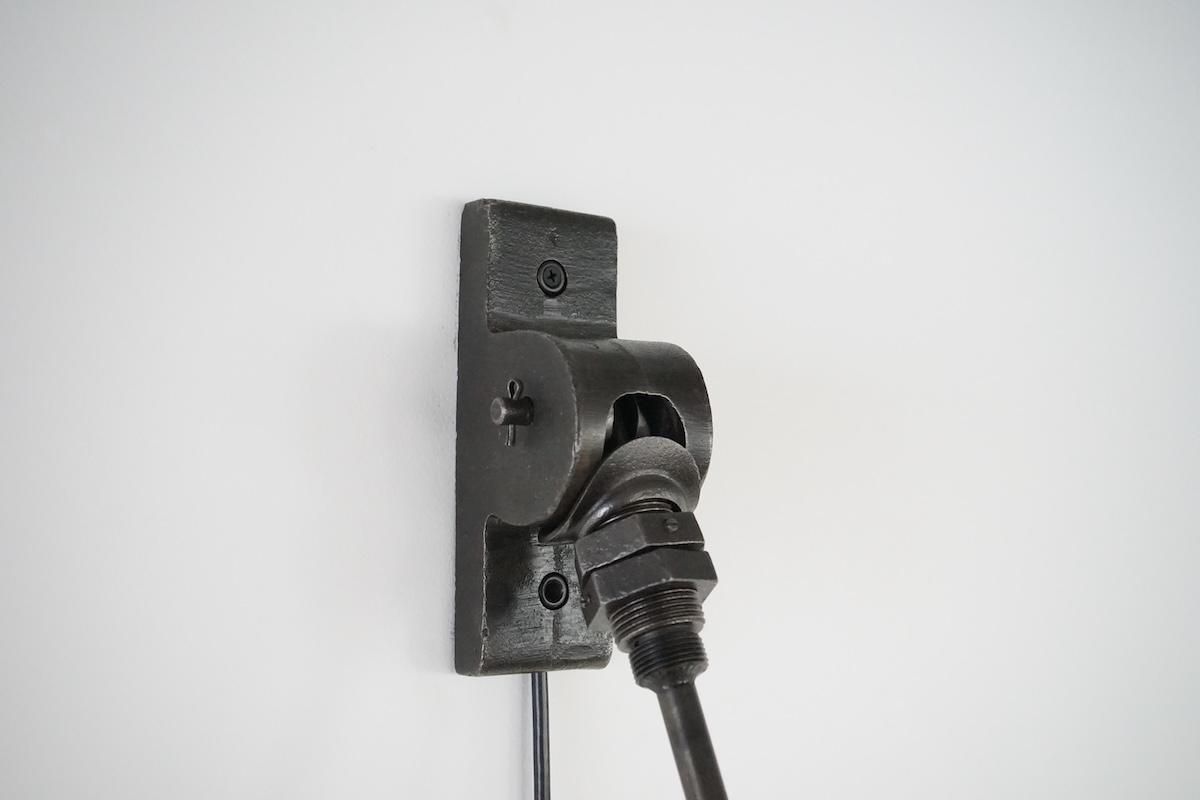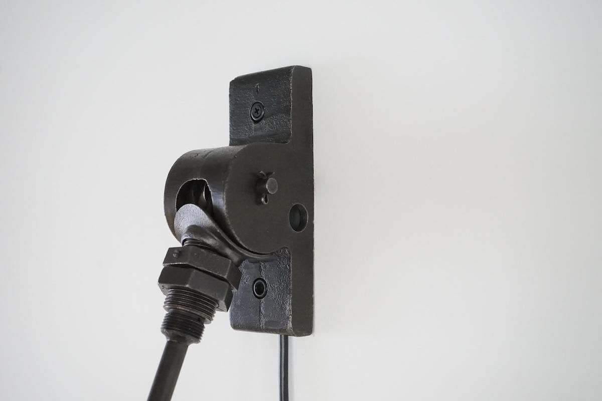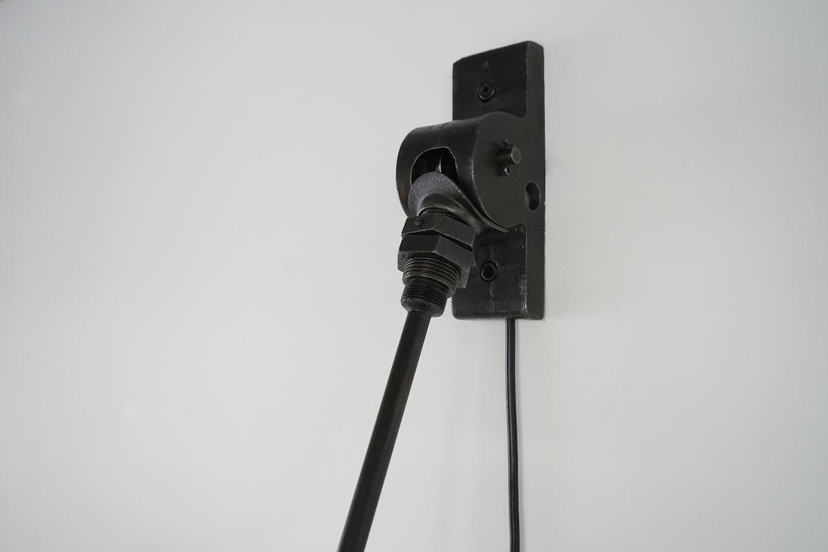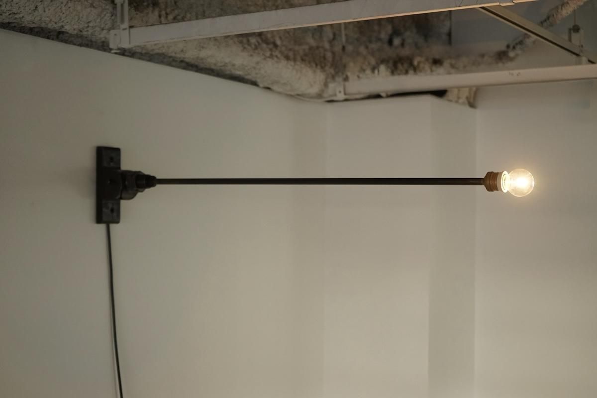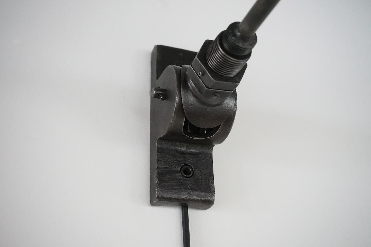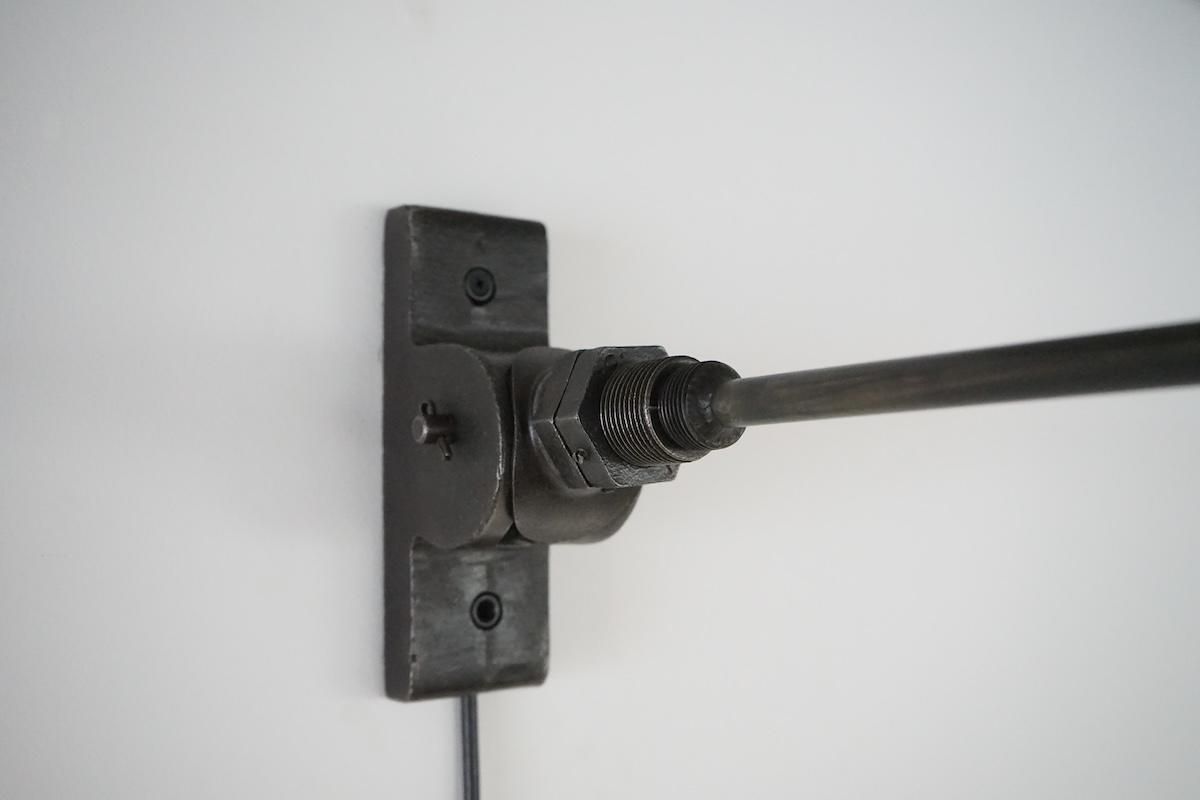 フランス製のインダストリアルウォールランプ。ベース部分は鋳物製でナットを緩める事で上下に可動しお好きな角度で固定できます。ナットは工具を使用しなくても手で回せます。インダストリアルらしい重厚感もありながらシンプルなデザインなので空間を問わずご使用頂けるかと思います。全体的に錆を落としブラックポリッシュにて仕上げております。